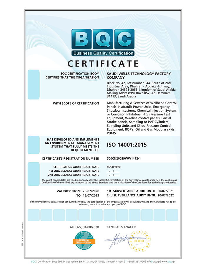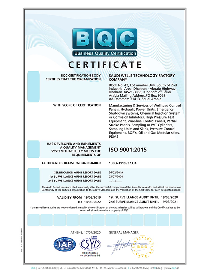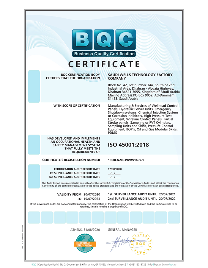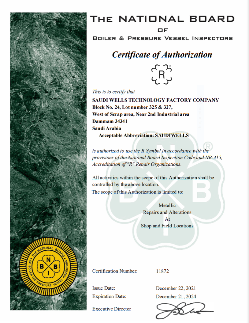 Saudi Wells Technology Factory Company (SWTF) is an ASME U stamp and R stamp, ISO 9001:2015, ISO 14001: 2015, OHSAS 18001:2007 certified company, our product goes through various, thorough product, raw material, design and validation tests and analysis.